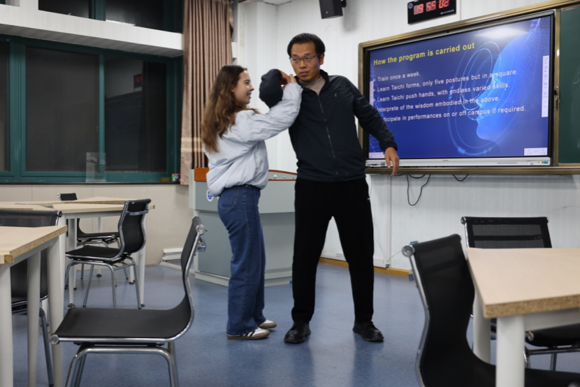 邵建春以“太极推手”为核心切入点,巧妙串联日常生活场景、学科知识应用与人工智能时代发展背景,打破文化与语言的壁垒。他通过具象化的动作演示、生动的案例解析,将太极所蕴含的“阴阳平衡”“顺势而为”等核心智慧,与现代生活、学术研究及科技发展相结合,让抽象的文化理念变得可感可知。留学生们在互动体验中主动提问、积极交流,逐步建立对中华文明的深度认知与情感共鸣。