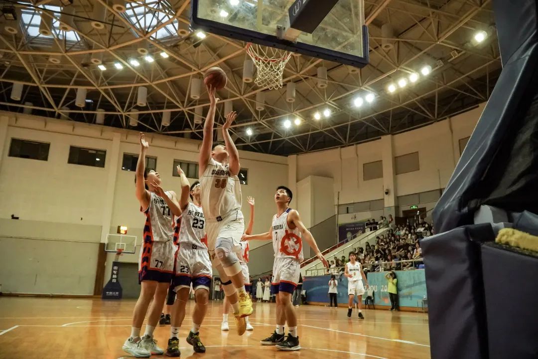 男子篮球决赛在行健馆篮球场上举行,国商男篮队与东教男篮联队展开了冠军争夺战!双方蓄势待发,紧张对峙,只待哨声吹响,球影落下。