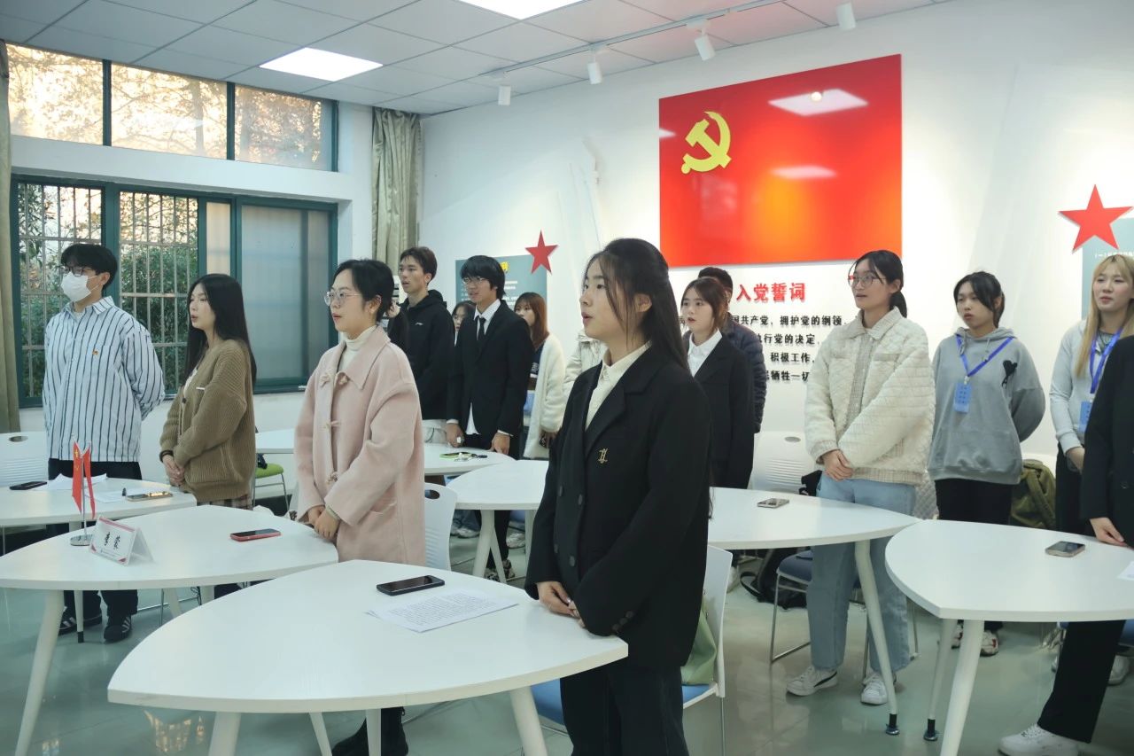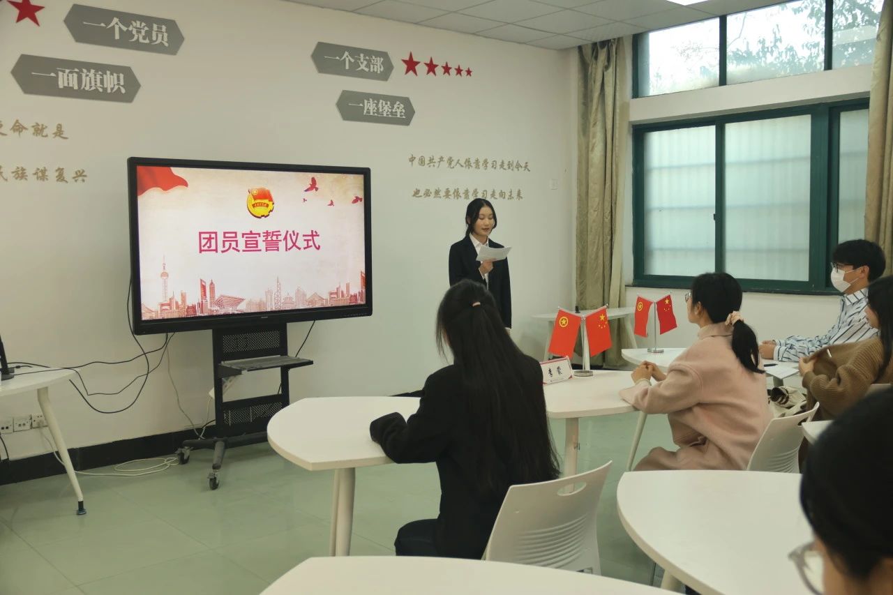 院团委组织部负责人郁玉梅和薛雨欣为新团员佩戴庄严团徽。一枚枚团徽闪耀着、指引着团员青年们坚定发展方、厚植家国情怀。