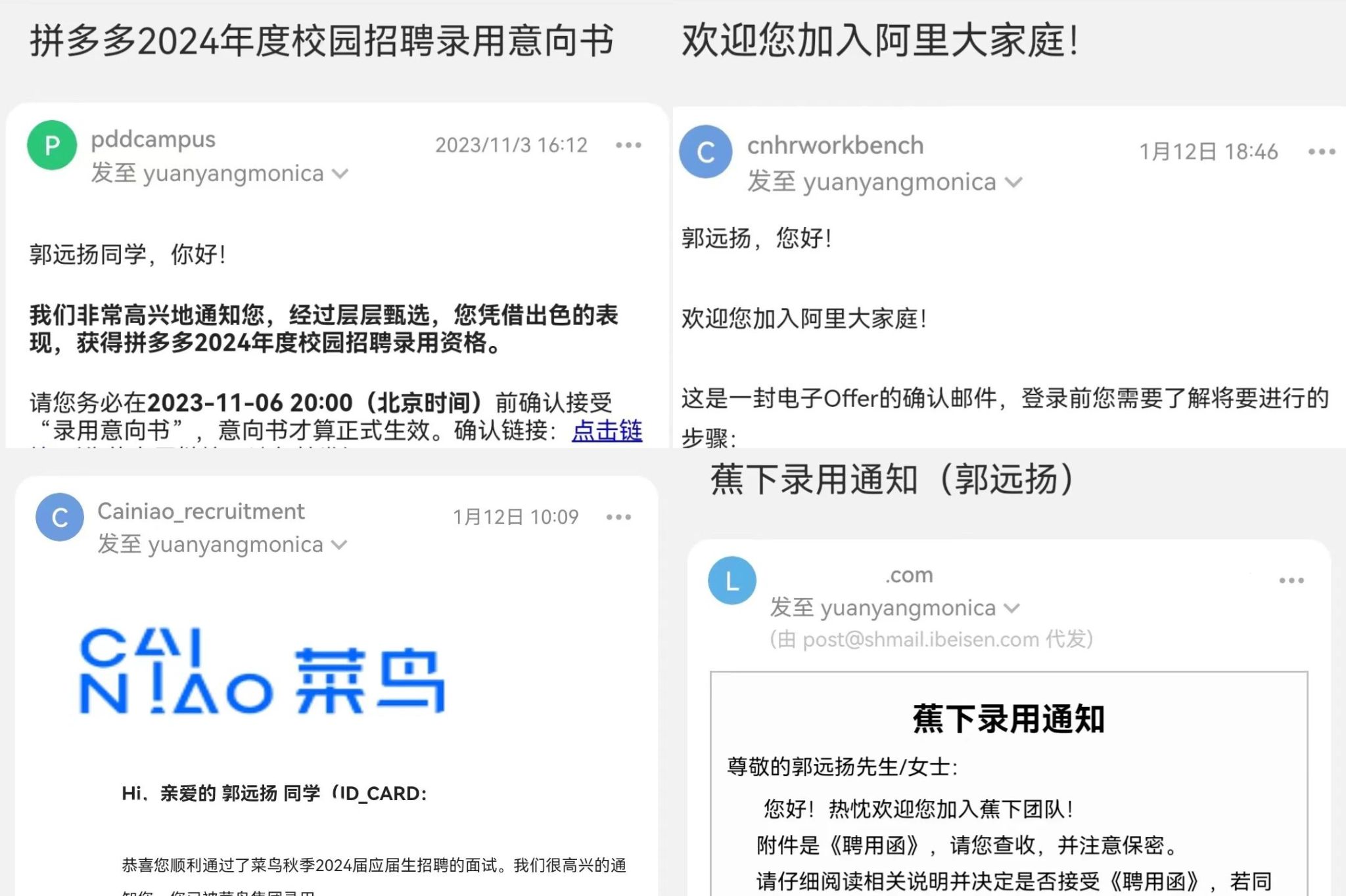 担任四年班长、校全媒体中心主席、国家奖学金获得者、省优秀毕业生,省级A类竞赛累计获奖9次,曾于网易、快手实习,并在2024届校园招聘中先后收获了来自拼多多、菜鸟、蕉下、认养一头牛等公司的offer……来自20跨电1班的郭远扬从大二起就下定了毕业后直接就业的决心。“学院拥有比较浓厚的创业氛围,学院老师积极带领我们将理论与实践相结合,我也收获了电商平台运营知识,我想这是书中学不到的。结合个人性格偏好感觉更偏实战型,所以希望毕业后直接就业。”