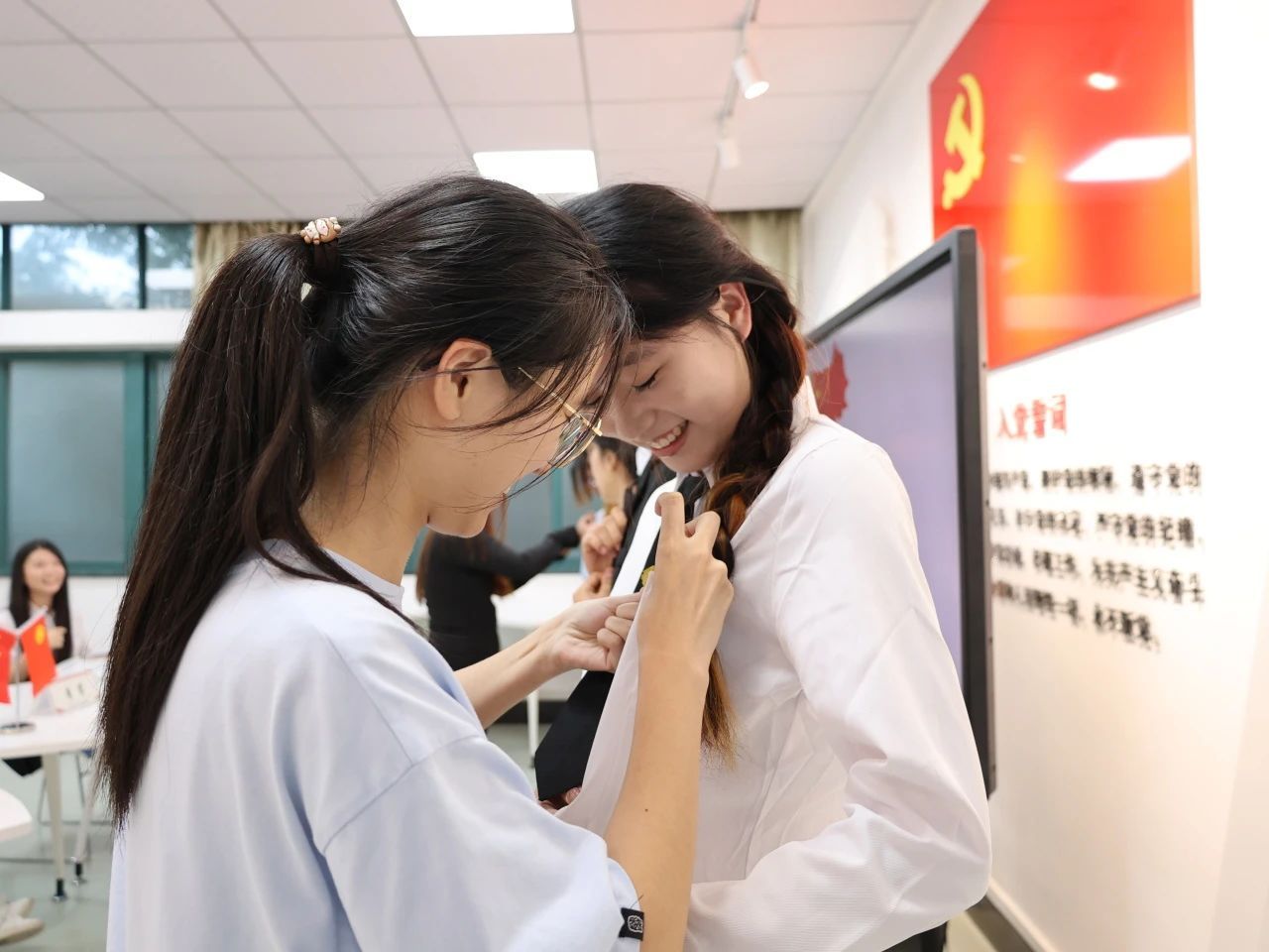 院团委组织部负责人郁玉梅和薛雨欣为这批新团员佩戴团徽。一枚枚团徽闪耀着、指引着团员青年们坚定发展方、厚植家国情怀。新团员们肃立在团旗前,目光坚定,右拳紧握,庄严宣誓。每一个宣誓的词语仿佛在空气中凝结,表达着他们对团旗下的誓言,对共同理想的忠诚。这不仅是一种仪式,更是一种自我约束和奋发图强的承诺。