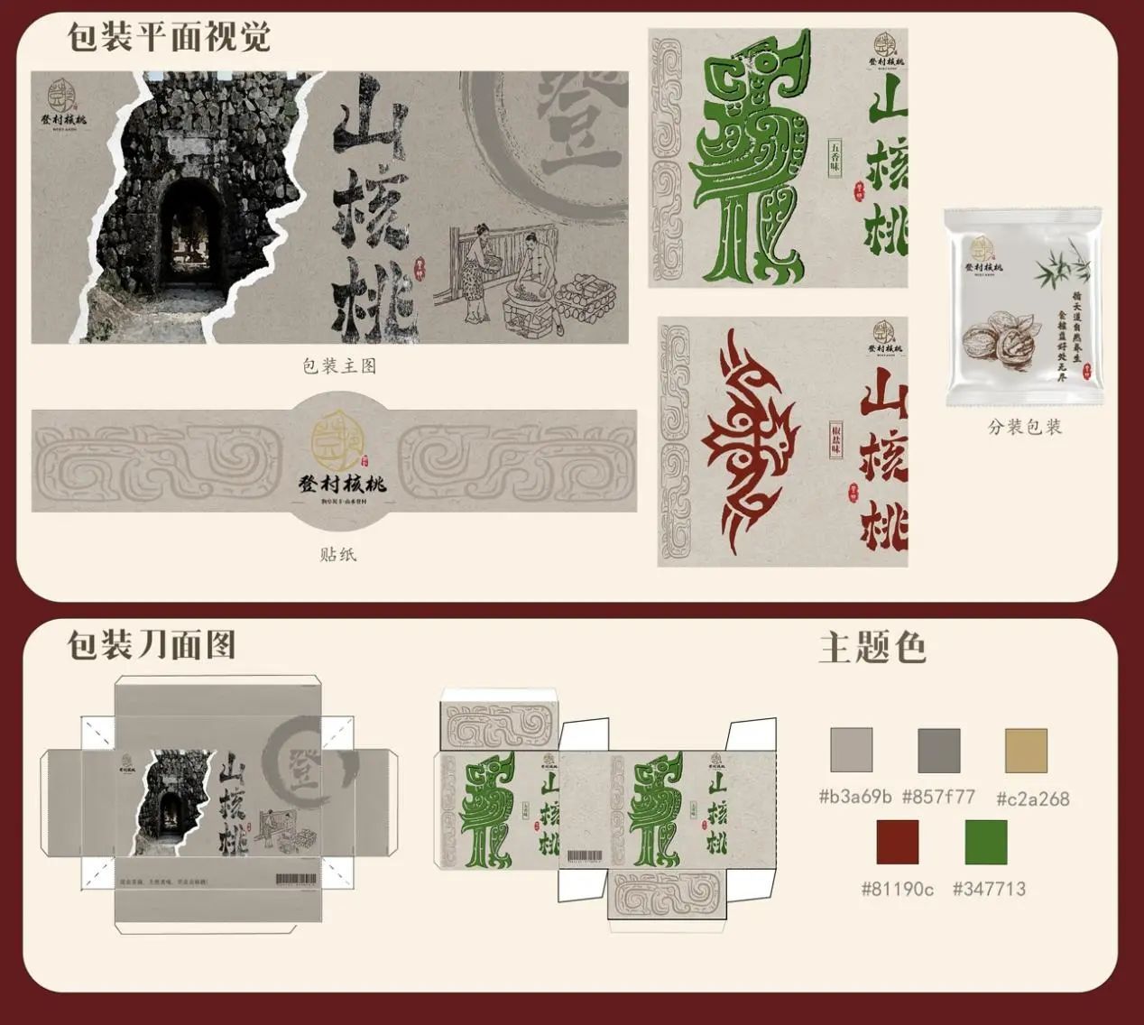 实践团队还考察了登村村历史文化积淀,并结合产品特性和地域特色,为当地山核桃设计了具有标识性的logo和全新产品包装。
