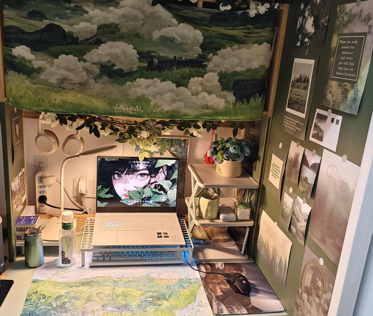 设计理念:以霍格沃茨四大学院为灵感,采用红金、绿银、蓝铜、黄黑的色彩搭配,营造独特的魔法寝室氛围。墙壁装饰以学院旗为特色,增添魔法气息。利用光影效果,如挂灯打造神秘感。此外,墙壁还装饰有墙贴和照片,增添寝室成员们的归属感。