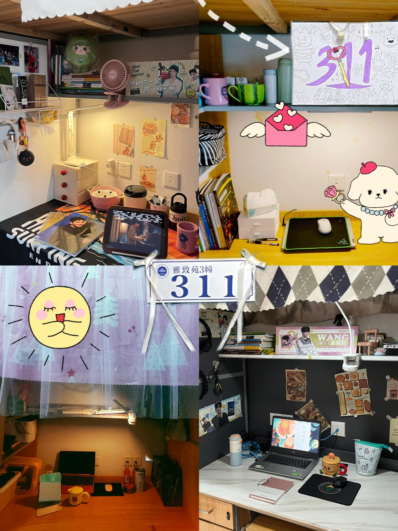 设计理念:“花开富贵集团”。以“花”为核心元素,象征自然与美好的融合,以鲜花的点缀为寝室注入温馨、活力与和谐的氛围。同时,结合四位成员各自的独特风格,无论是简约、优雅还是活泼,都能在寝室空间中和谐共存,彰显团体的多样性与包容性。