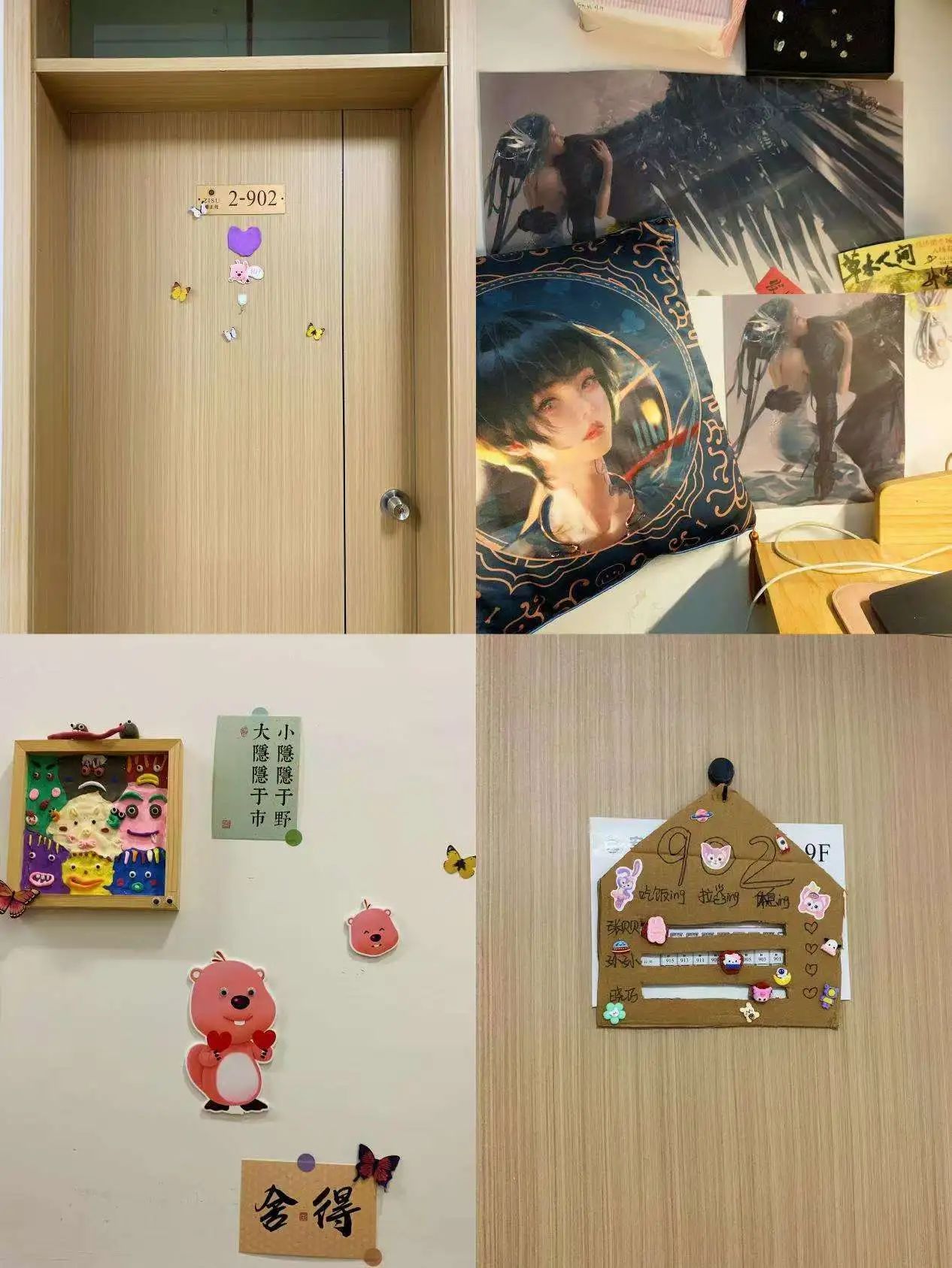 设计理念:“室事如意”。希望寝室作为个人与集体生活的小空间,可以促进成员们的和谐共处。所以有了寝室门口的“福”字窗花和“充电站”的设计。“更上一层楼”是我们认为寝室也是学习与成长的空间,希望我们在大学的学习中可以学业有成。