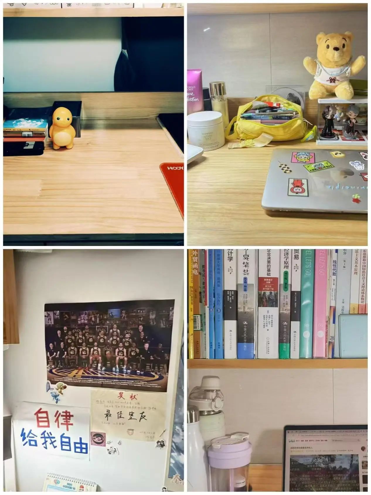 设计理念:“疯狂星期四”。寝室,是我们的青春小窝,我们寝室主打“温馨、舒适、美观”,要让它成为校园里最温暖的避风港! 温馨是小窝的灵魂。贴上我们的专属元素,摆放从家里带来的小玩偶,再加上一串串暖灯,夜晚一打开,整个寝室都被爱意笼罩,超有家的味道。