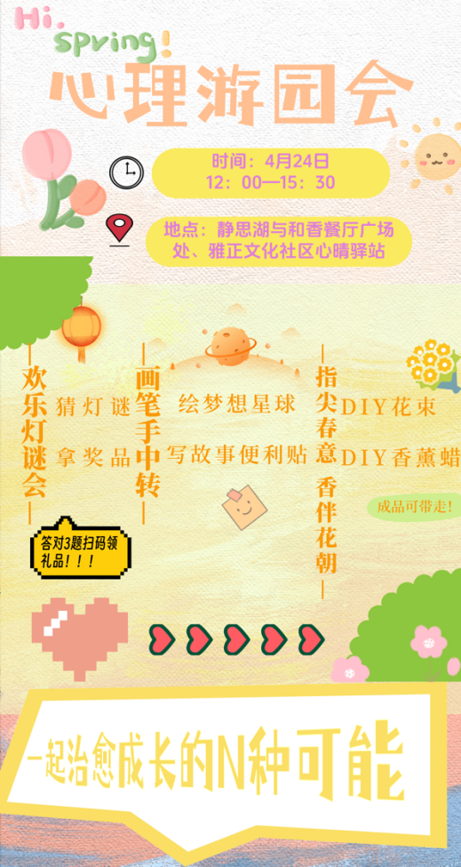 亲爱的同学们,春和景明的校园里,当DDL、社交圈与生活琐事交织成网,你是否感觉到“心理过载”?认知心理学研究表明,定期心理调适能有效提升情绪弹性,所以不妨给自己一个“心灵缓冲区”,在4月24日的游园会中,开启自我关怀的春日仪式吧!