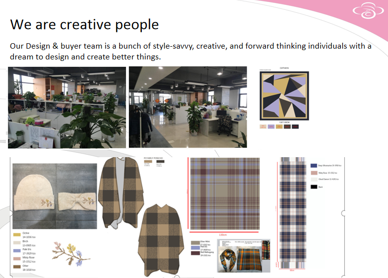 杭州嘉品服饰有限公司创建于2015年11月,是一家专业出口时尚服饰的公司,产品包括围巾,手套,帽子,披风以及时尚皮带箱包等。公司经营地址位于浙江省第一大城市,人间天堂杭州,杭州拱墅区杭行路666号万达广场C座1805-1818室。公司以质量第一,信誉至上的经营理念。经过近几年的奋斗已经具有一定规模,年出口量在1000万美元左右。产品远销欧洲,美国,加拿大,其中60%以上为国际知名品牌,如ZARA,NEXT,ONLY,PIECES,公司信誉良好,具有巨大发展潜力。