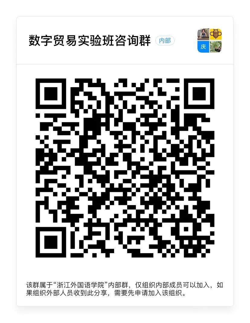 可来电或在线咨询。有报名意向的同学可以扫码进入钉钉群“数字贸易实验班咨询群”。