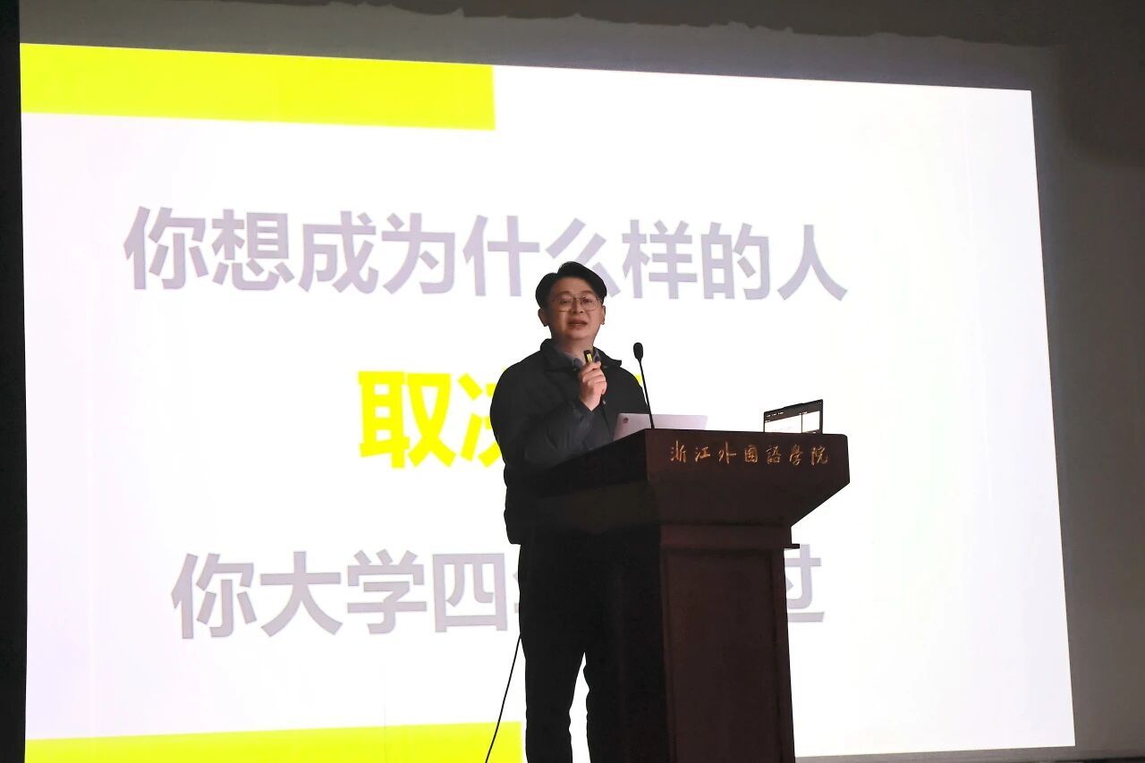 副院长贾新明,党委副书记、纪委书记顾小明,北京大学国际关系学院与光华管理学院校友、鲸纬咨询CEO、地缘政治及出海研究学者孙心悦,浙外工商行业校友会副秘书长、欧罗外语创始人、2019届西班牙语专业校友朱烜,2025级新生辅导员及全体新生参与活动。