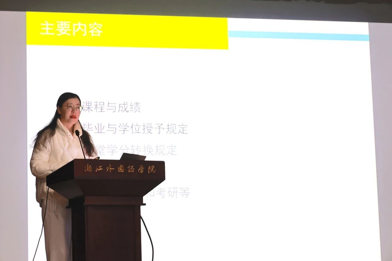 课程体系、学分结构与学业要求,清晰梳理了各专业学科基础课程的核心架构,明确“平时成绩+期末考核”的综合评价模式,并提醒有国外升学意向的同学重视日常学业积累。针对缺考、缓考、补考等特殊学业情况,她强调了学术诚信的重要性,对作弊等违规行为划定红线、明确要求。此外,她还拆解了毕业证书获取要求与毕业论文的关键时间节点,为新生学业规划提供了指引。她还介绍了91porn