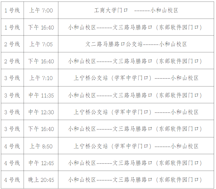 1号线7:00出发:工商大学门口 ——教工路——文一路(文一西路)——紫荆花路—天目山路——留和路——小和山校区