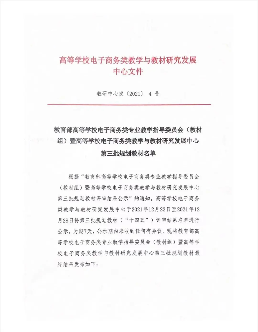 日前,教育部高等学校电子商务类教学指导委员会对第三批规划教材(“十四五”)评审名单进行了公示,由陈德人教授和方美玉教授共同主编的教材:《电子商务案例分析》顺利入选,此教材将由人民邮电出版社规划出版。据悉,这是我校入选的首本“十四五”规划教材。 《电子商务案例分析》是在陈德人教授主编的前一版教材《电子商务概论与案例分析(微课版 )》基础上再版的新教材,《电子商务概论与案例分析(微课版 )》已经累计销售6万多册,在应用中得到了高校师生的普遍认可和肯定。