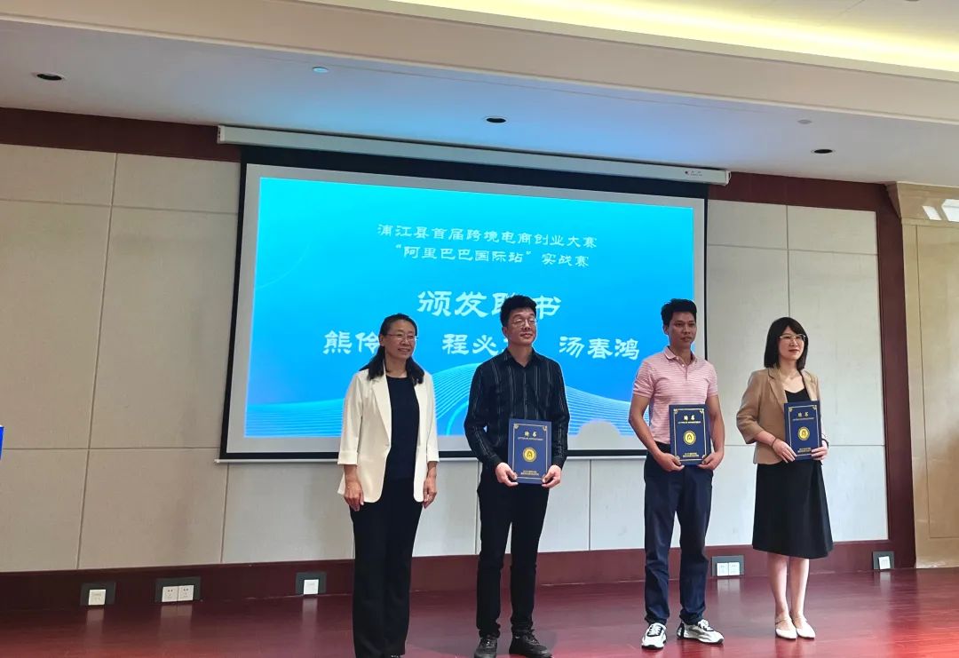 随后的校企合作环节,跨境电商浦江研究院与学生创业孵化团队成功签订创业孵化协议,同时,柴校长为三位优秀企业家熊伶俐、程必文、汤春鸿颁发了企业导师聘书。