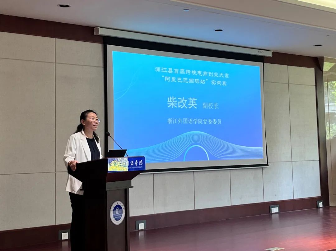 我校党委委员、副校长柴改英致欢迎辞。她对莅临本次大会的嘉宾表示热烈欢迎,随后她指出学校将会持续围绕国际化人才培养目标,继续服务浙江省数字经济和外向型经济建设,努力贡献浙外智慧,培养应用型人才;最后,柴校长希望浙外学子能够踊跃参与大赛,赛出浙外风采。