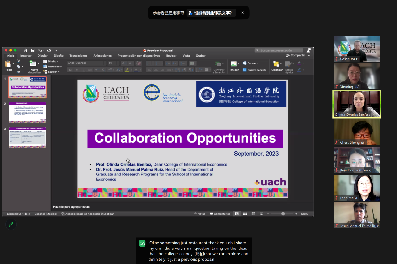 与墨西哥奇瓦瓦大学国际经济学院就跨境电商人才培养和国际合作等议题进行了在线交流。奇瓦瓦大学珍视与我校的合作,提出了分步骤、不同类别的合作计划,包括学生交流、师资培训、共建专业等。