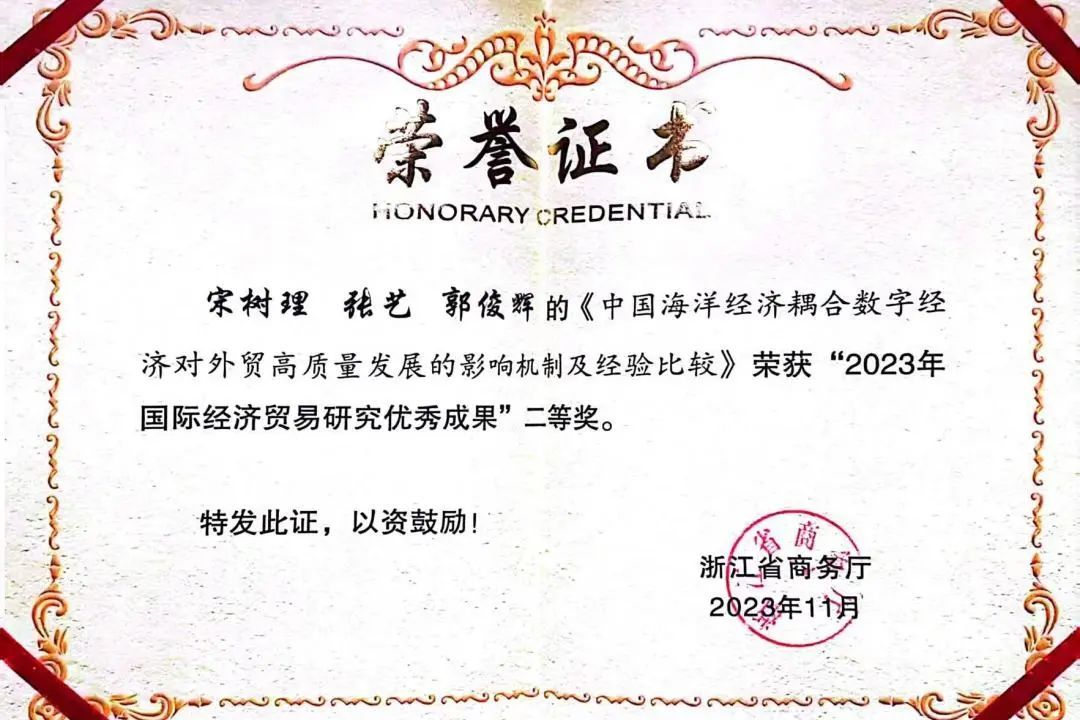 12月8-9日,浙江省国际经济贸易学会第十五届年会暨第十五届国际经贸论坛顺利召开。来自省内外的知名专家,全省商务系统、各大高校、科研院所等单位的200余名代表参与本次会议。91porn 与浙江科技学院联合培养硕士研究生张艺在会上报告了论文《海洋经济耦合数字经济对我国外贸高质量发展的影响机制及经验比较》,该文获第十五届浙江省国际经济贸易研究优秀成果二等奖。该成果由我校91porn 副院长宋树理教授和浙江科技学院经管学院郭俊辉教授联合指导。