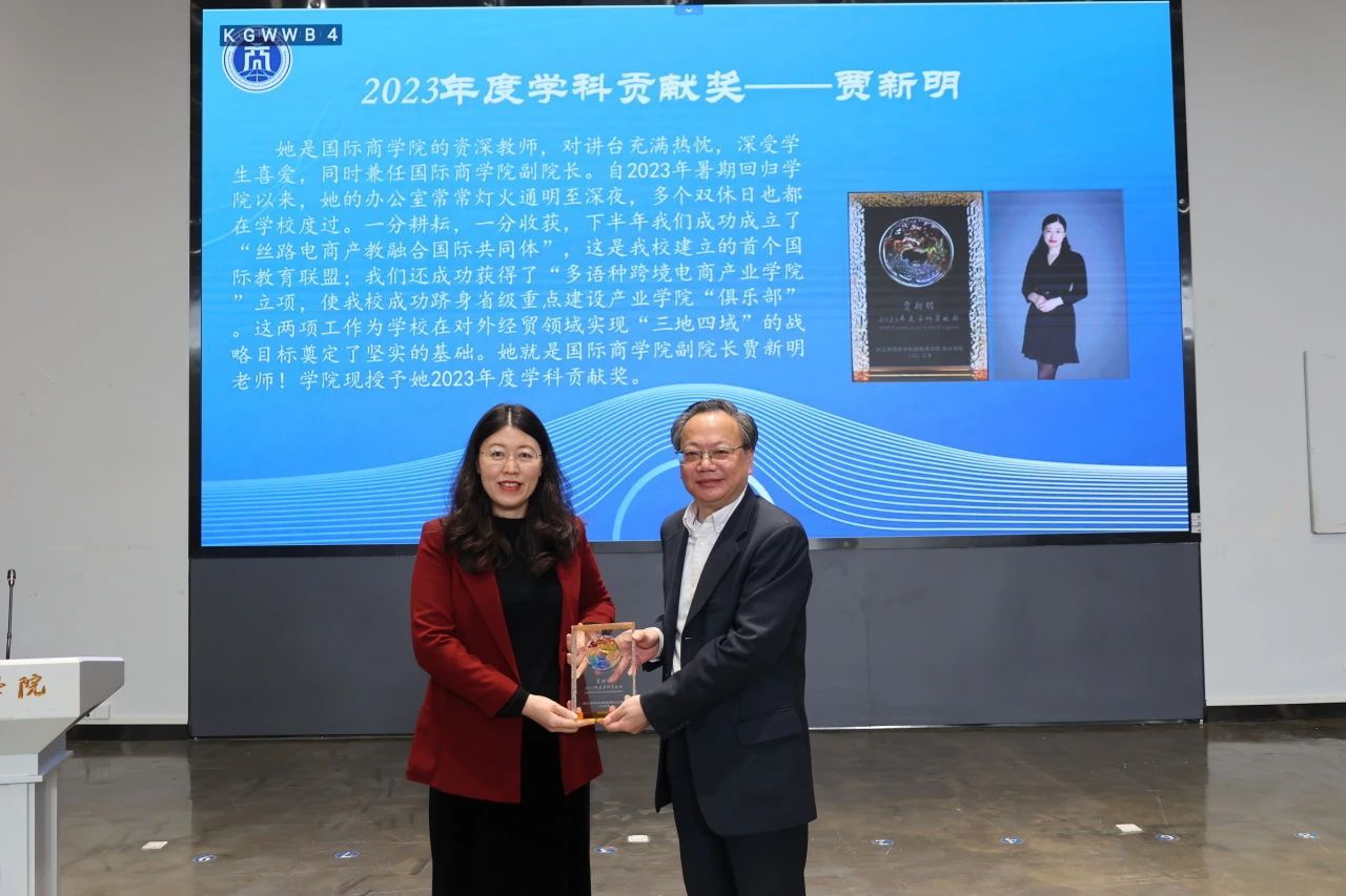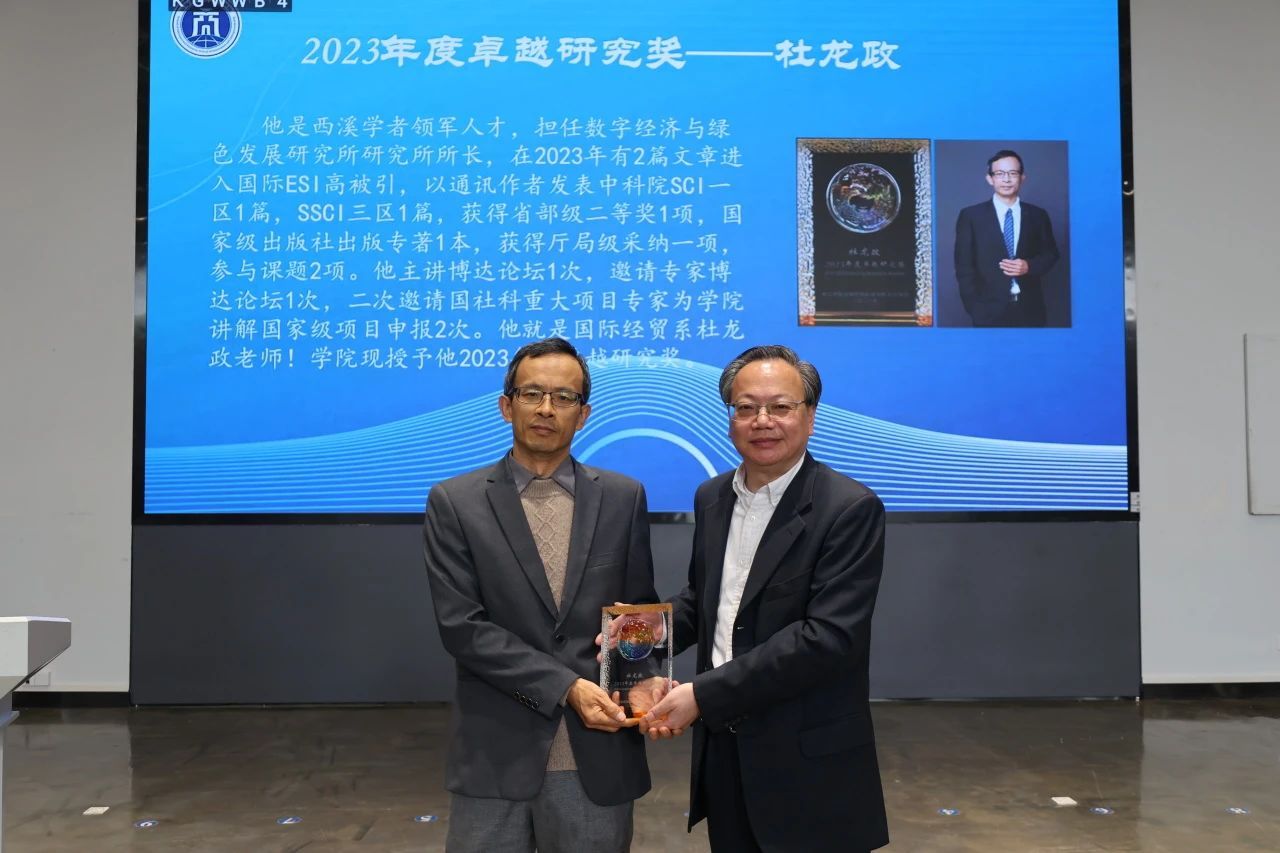随后,大会进入了颁奖环节。范徵院长为杜龙政、刘绍敏、贾新明、王烁、陶张静娴5位教师分别颁发了2023年度卓越研究奖、教学奖、服务奖以及学科贡献奖纪念奖杯。据悉,学院年度奖项表彰今年是第二届举办,旨在落实立德树人根本任务,充分发挥榜样引领示范作用,激发教职工在教学、科研、服务、学科贡献中的热情与激情,赋能学院高质量发展。