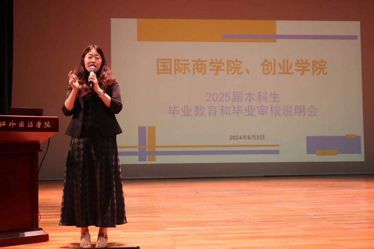 学院副院长贾新明为2025届毕业生解读毕业实习、学年论文安排及毕业审核要点。她解答了专业见习和毕业实习的教学安排及常见问题,详细说明了毕业论文的时间节点安排及撰写要求,解释了毕业审核流程和学位授予条件,介绍了海内外升学的申请条件与信息获取渠道。