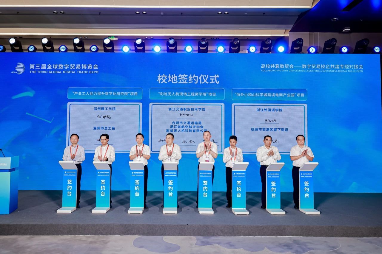 为进一步加强数字贸易领域的学术交流,深化产教融合,推动“政校企产教研”互动循环,9月26日,第三届全球数字贸易博览会之“高校共襄数贸会——数字贸易人才校企共建专题对接会”在杭州大会展中心隆重举行。会议由浙江省人民政府主办,浙江省商务厅、浙江省教育厅、浙江省人力资源和社会保障厅联合承办,230余家政府、企事业单位参会。校党委副书记严齐斌带队参加。