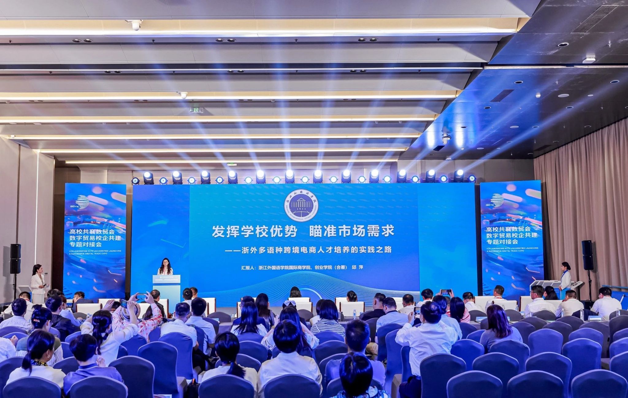 、创业学院(合署)党委书记、副院长邱萍作为高校代表,在校企合作推介环节中作浙外多语种跨境电商人才培养实践分享。