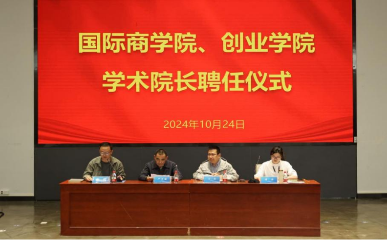 在望C116举行学术院长聘任仪式。校党委副书记严齐斌,党委组织部、统战部副部长崔庆,商学院、创业学院班子成员、全体教职工参加大会。