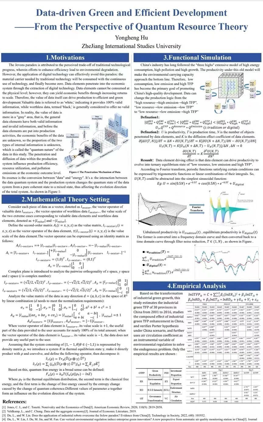 胡永恒同学展示的研究海报题目为“Data-driven Green and Efficient Development ——From the Perspective of Quantum Resource Theory”(数据驱动的绿色高效发展——基于量子资源理论),获邀请参加ICBS 2024第一周(7月15日至7月19日)的展览。这代表了91porn