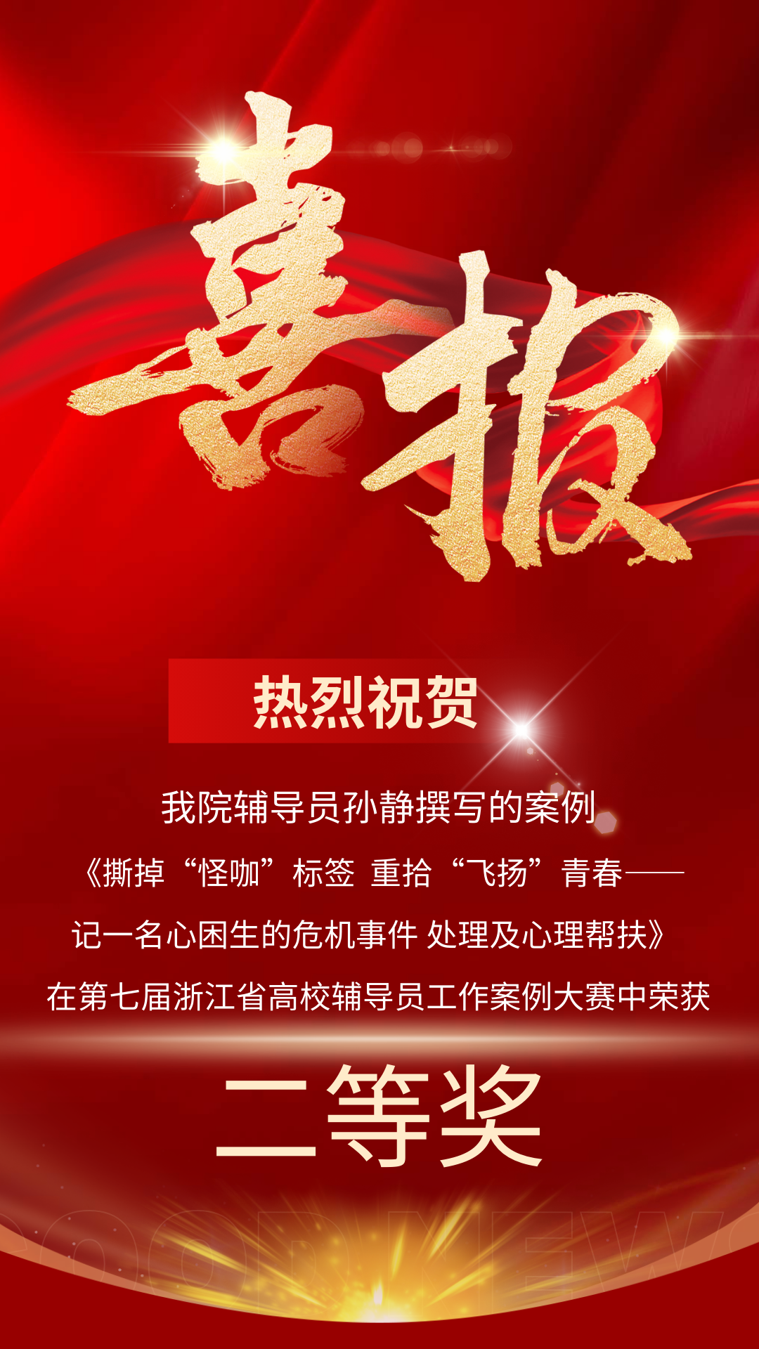 辅导员孙静老师撰写的工作案例荣获第七届浙江省高校辅导员工作案例大赛二等奖。