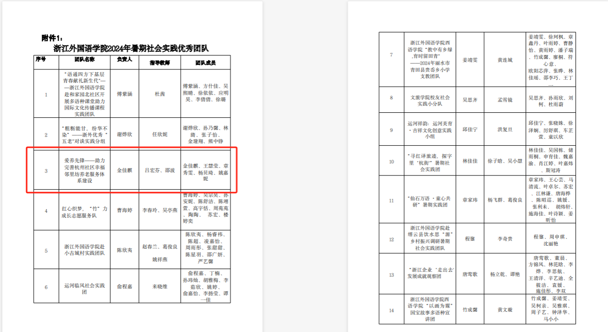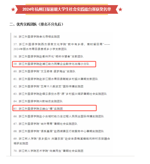 云端山‘耀’实践团”获评杭州日报暑期大学生社会实践擂台赛优秀实践团队,“爱养先锋——助力完善杭州社区幸福邻里坊养老服务体系建设实践团”获评2024年学校暑期社会实践优秀团队。