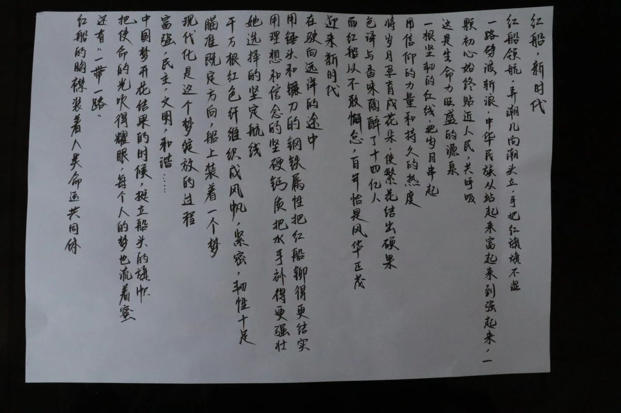 内容出处或创作立意:以红船精神为核心,通过七言律诗与硬笔书法融合,艺术化展现中国共产党开天辟地.敢为人先"的革命初心。作品以视觉艺术唤醒红色记忆,让红船精神在笔墨间焕发时代光辉。