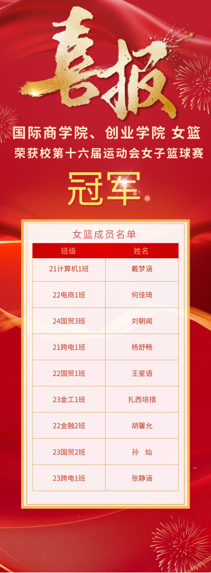 男篮、女篮最终一举夺得两项冠军,斩获优异成绩!这份对体育的热爱、对梦想的追求将永远留在每一位商学院学子的心中。让我们共同期待下一次赛场相聚,继续以篮球为媒介,传递正能量,展现商学院青年的青春风采!
