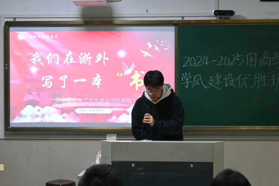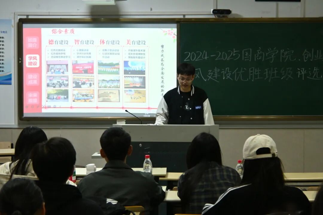 评选现场,各班代表通过PPT展示,呈现班级管理、学风建设、实习实践及奖项荣誉等核心亮点,充分彰显了班级凝聚力与学院浓厚的向学氛围。如23国贸1班秉持“以赛促学、以赛促创”理念,将理论知识与实践应用深度融合,累计斩获国家级奖项4项、省级奖项10余项及多项校级奖项,充分展现了班级同学扎实的专业实践能力、高效的团队协作精神与敏锐的创新思维;24电商2班则以“思想引领”为核心原点,构建起立体化优良学风体系,不仅组织开展12次以上主题团课与理论学习活动,涌现出6名课程平均学分绩点3.5以上的优秀学子,更在学科竞赛中收获省级奖项5项、校级奖项14项,同时积极投身社会实践,班级志愿者累计服务超1000人次,多名同学获评“优秀志愿者”,以学业精进与担当奉献双向发力,彰显了向上向善的班级风貌。