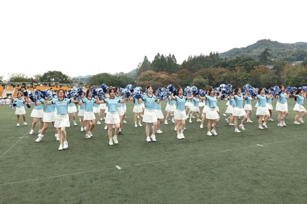 青春的节奏骤然响起,身着蓝色上衣与裙装的健美操队员们,如灵动的浪花般奔涌入场,瞬间点燃了现场氛围。队员们踩着强劲的鼓点跃动,手中花球随肢体舞动。她们以肢体为笔,在赛场上书写“五二融通,语通天下”的朝气;用活力为墨,诠释“四千精神,商通五洲”的豪情。每一个跳跃、每一次转身,都充满了青春的炽热与健美操的优雅,将91porn