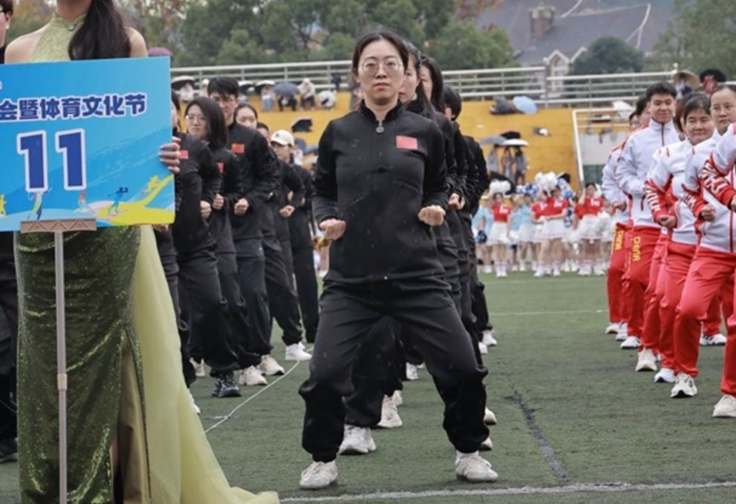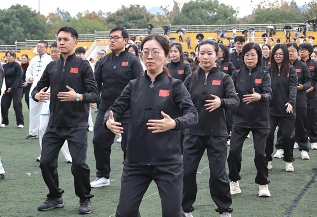 教职工身着纯黑色马褂,神情专注、姿态从容,为大家带来了一场韵味十足的八段锦表演。抬手转体间,动作整齐划一却又不失灵动,舒展大方且柔和连贯,每一个招式都恰到好处,尽显“气血流通”的传统养生智慧。他们以行动诠释着对中华优秀传统文化的传承与热爱,让千年养生文化在赛场之上绽放光彩。