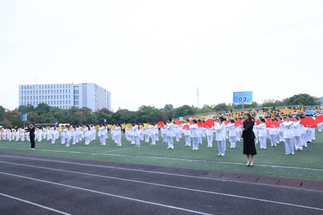 身着传统服饰的学子们列阵而立,手中折扇开合间如蝶翼翻飞,尽显灵动之美。伴着悠扬的旋律,太极拳招式缓缓展开,行云流水、刚柔并济——抬手如揽月,落步似扎根,每一个动作都精准到位,既蕴含着“以柔克刚”的文化精髓,又展现出“四两拨千斤”的智慧奥秘。学子们动作整齐如一,出拳铿锵有力,扇舞利落洒脱,让传承千年的太极文化在青春赛场焕发出全新活力!