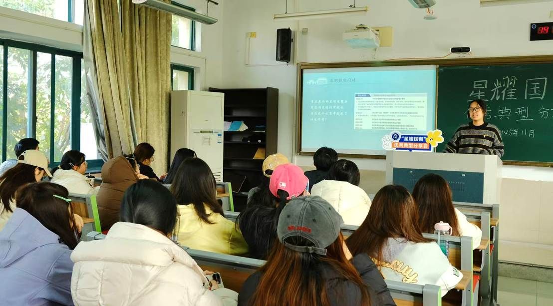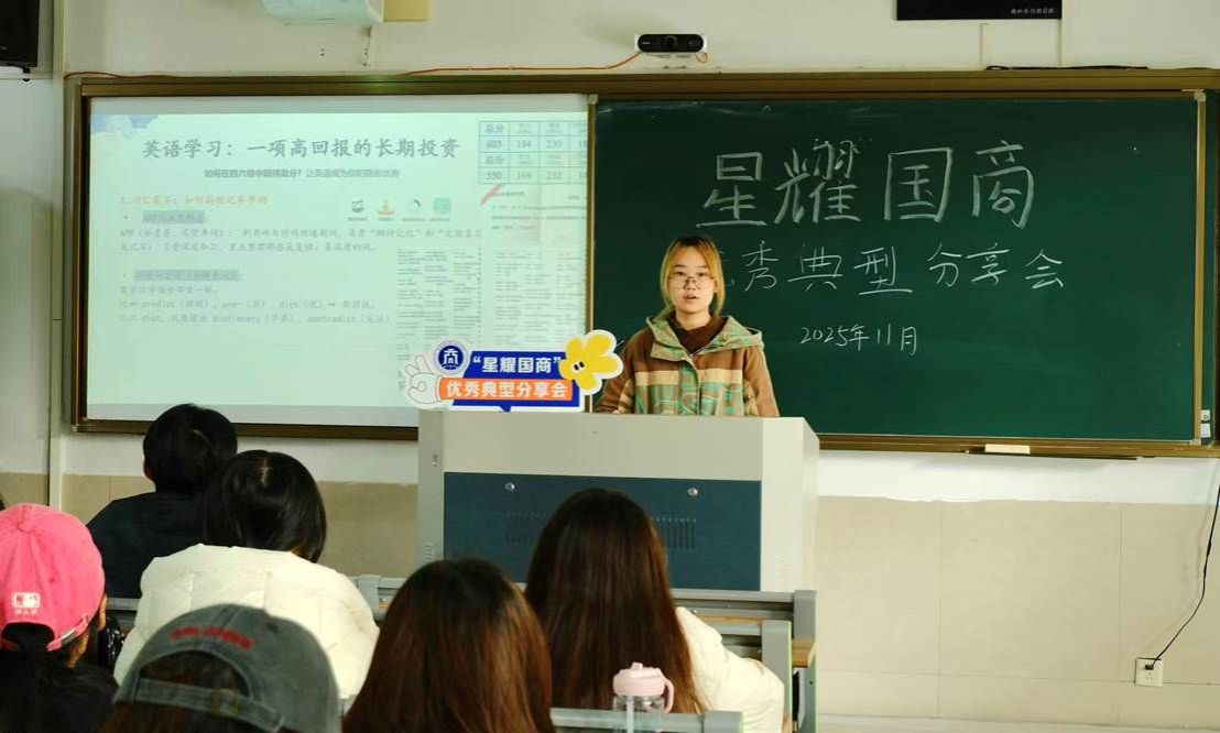 举办“星耀国商”优秀典型分享会。本次分享会邀请2024-2025学年度国家奖学金获得者刘梦洁、省政府奖学金获得者蒋沈洁,向学子分享学业、科研、竞赛等方面经验。