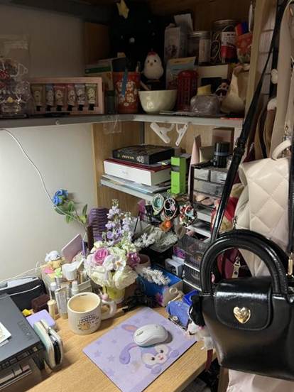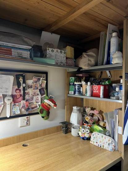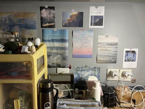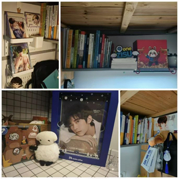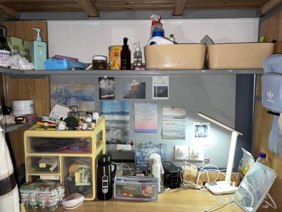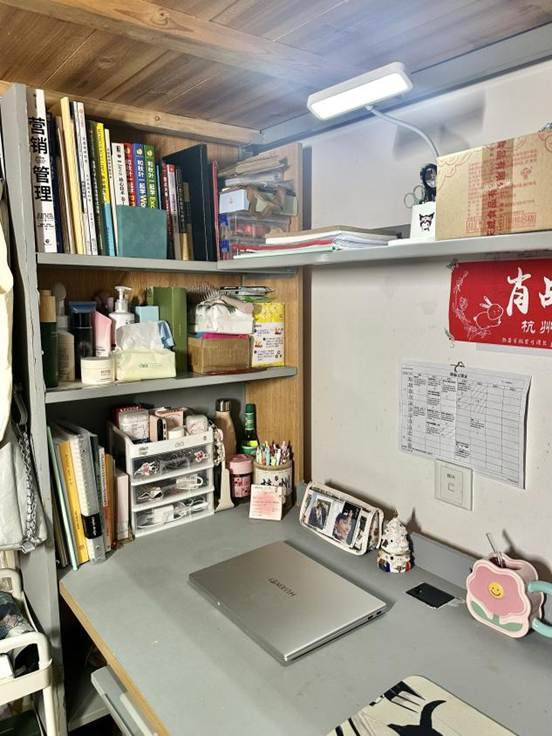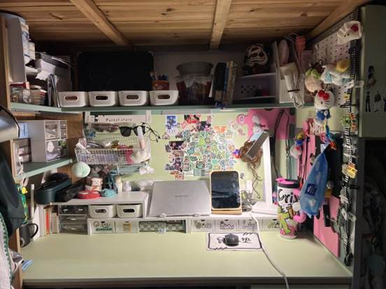既体现国商学子的学业专注,也通过点缀,让学习空间兼具生活烟火气,实现“学在寝室、乐在寝室”的功能融合。2.暖愈:以治愈系布置消解学业压力,让寝室传递青春的柔软温度。3.青春集:个体与集体的记忆拼图装饰中的个性化物件与集体收纳的规整感,既保留室友的个体特质,又通过共同布置形成“青春集合体”,诠释寝室作为“大学记忆容器”的独特意义。