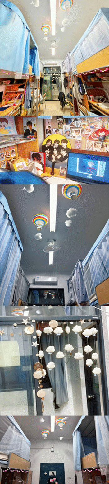 设计理念:我们的设计以“漫步云端·温软时光”为主题,旨在将寝室打造为一个拥抱温暖与治愈的梦想小窝。整体的灵感来源于对“家”的想象我们选用了毛球和云朵门帘作为主元素,象征着室友之间绵长的情谊。天花板上悬浮的热气球与云朵装饰,更是寓意着我们四人如同《飞屋环游记》中的冒险家,怀着梦想与憧憬,在大学的天空中自由翱翔。而门上垂下的圆片拉花,摇曳生姿,为这片小天地增添了灵动与生机。这不仅是一次寝室美化,更是我们为彼此构筑的一个可以共同做梦、互相依靠的温馨港湾。