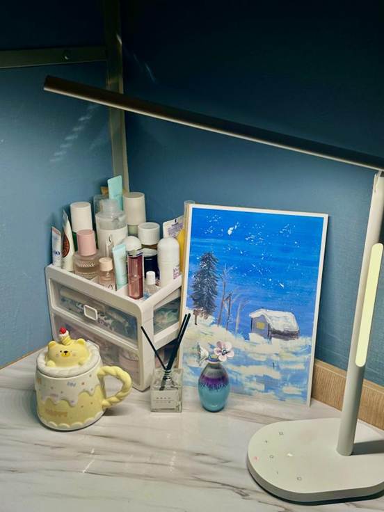 设计理念:我们的四人寝以“多元共生·个性交响”为核心设计理念,通过四张书桌的差异化布局,展现了每位成员独特的性格与生活态度,桌面在保证整洁的同时,又在色彩、功能性与情感表达上形成和谐共鸣,共同构建出既尊重个体空间又充满集体温度的栖息地。