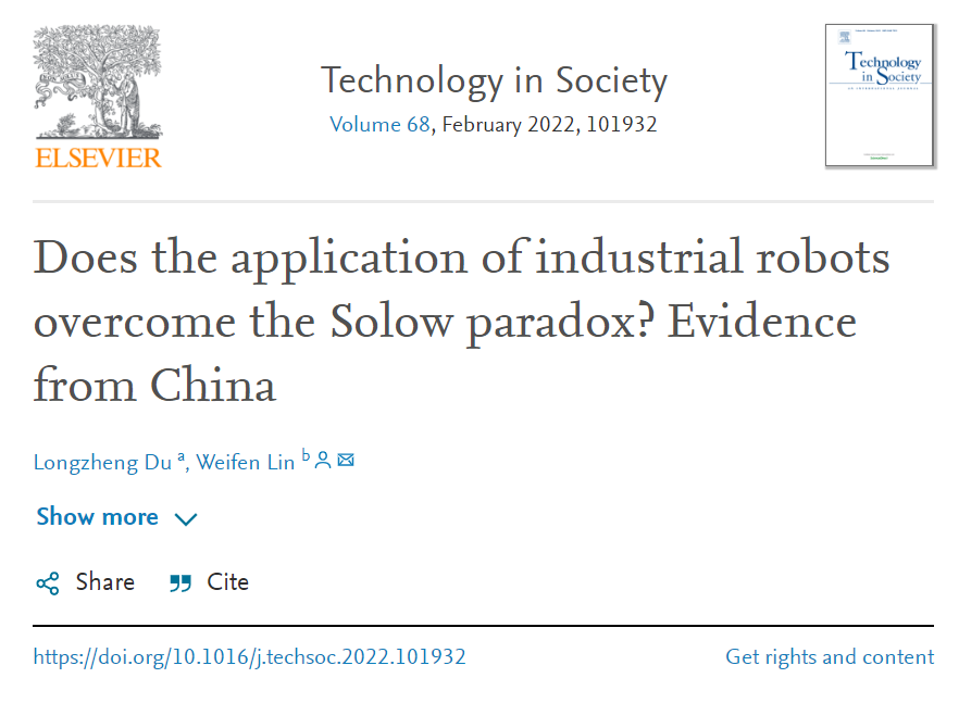 DuL,LinW. Does the application of industrial robots overcome the Solow paradox? Evidence from China[J].Technology in Society,Volume 68, February 2022, 101932. //doi.org/10.1016/j.techsoc.2022.101932