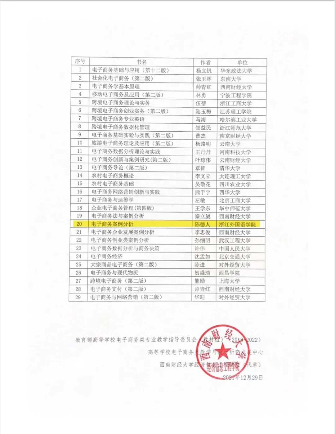 日前,教育部高等学校电子商务类教学指导委员会对第三批规划教材(“十四五”)评审名单进行了公示,由陈德人教授和方美玉教授共同主编的教材:《电子商务案例分析》顺利入选,此教材将由人民邮电出版社规划出版。据悉,这是我校入选的首本“十四五”规划教材。